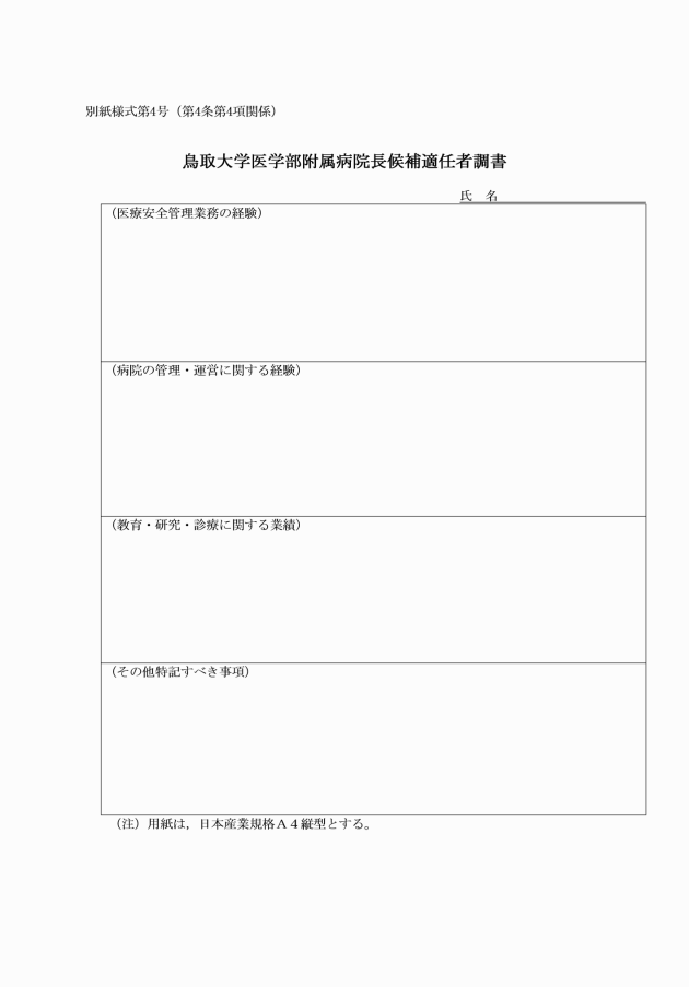 第4条 候補適任者の推薦は,医学部,医学系研究科,医学部附属病院及び米子地区事務部において常時勤務することを要する職員(鳥取大学医学部附属病院における特定任期付職員の任期に関する規則(平成17年鳥取大学規則第121号)に定める特定任期付職員を含む。)のうち,次の表に掲げる者2人以上の連署を必要とする。