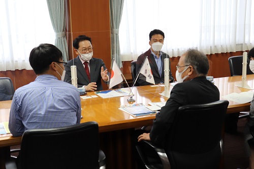 中島学長は、「大韓民国と日本は距離が近く、様々なつながりがあり、学生の旅行や留学先としても人気があります。大韓民国江原道と鳥取県の地域交流も活発で、本学の学生も両地域の交流25周年記念事業に参加し、江原道地域の学生たちと信頼関係を築き、深い友情を育みました。今後も大韓民国との協力が発展することを期待しています。」と歓迎の挨拶を述べました。日本に6年間の留学経験のある梁総領事は流暢な日本語で、「私自身が長年研究者だった経歴もあり、昨年12月就任以来、一日も早く鳥取大学を訪問したいと思っていました。鳥取県と江原道の交流は、多くの自治体からリスペクトされている優秀な交流事例です。今後も管轄地域の大学と連携を深めていきたいと思いますので、ご協力お願いします。」と御挨拶されました。その後は、研究者同士の話にも花が咲き、楽しく語り合う時間となりました。